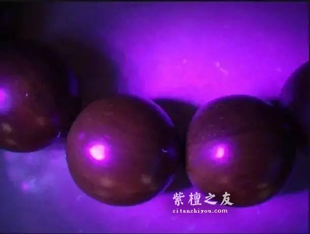 上过胶的小叶紫檀在紫光灯下有荧光反应
