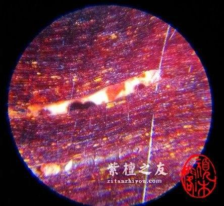 在光合的过程中会形成一些碳酸(HCO3)或者酸水存在植物毛细孔在碳酸钙遇到酸水后通常生产碳酸氢钙CaCO3+H2O+CO2=Ca(HCO3)2,它们溶解于水中,当水份挥发掉后,溶液中会析出碳酸钙沉淀物,而铁离子被吸收后同样会产生黄色碳酸铁,经过几百年便形成了金星,小龄紫檀是没有金星的。