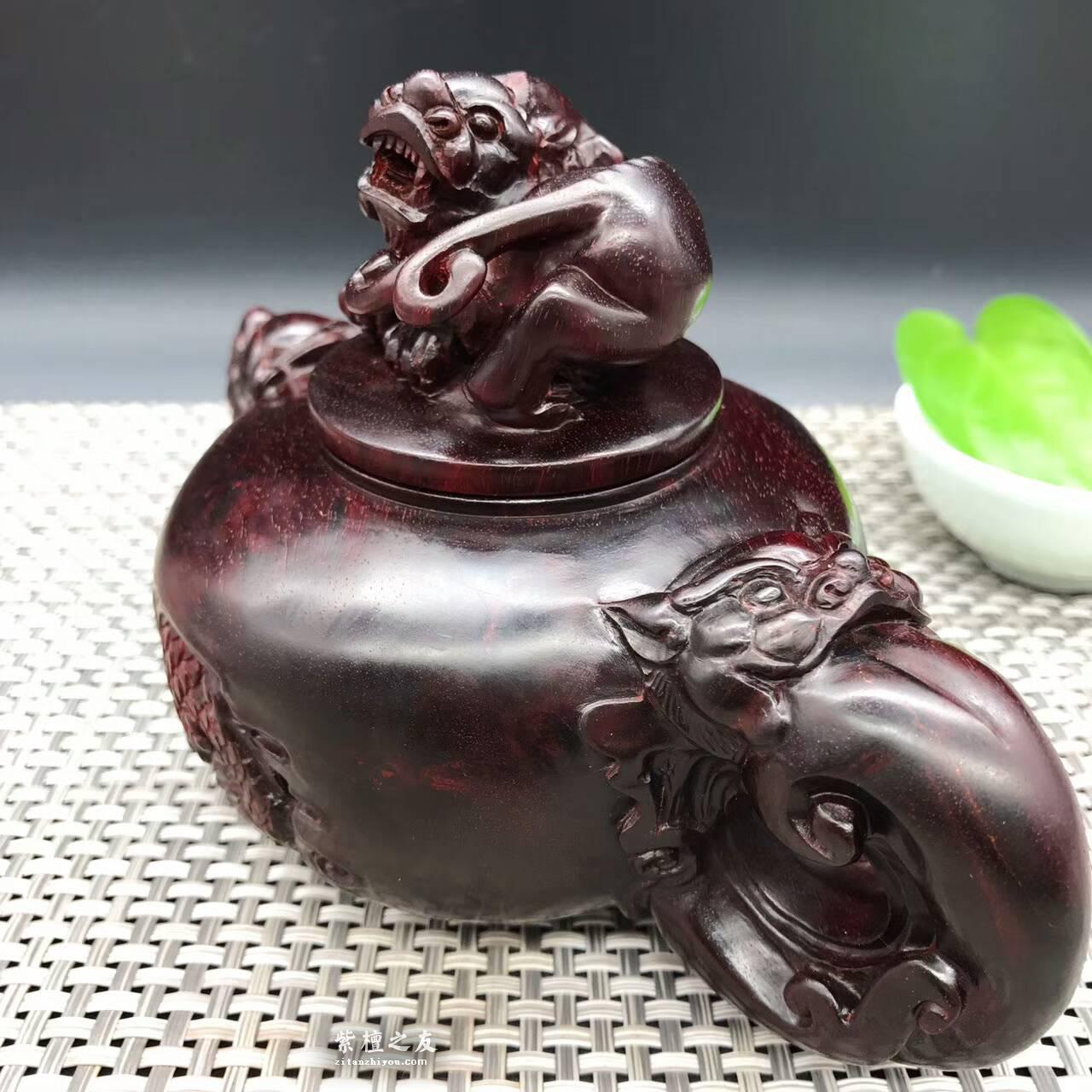 印度小叶紫檀纯手工雕刻,壶把件,精雕貔貅瑞兽,寓意招财进宝,财源滚滚!长16.8宽9.8高11cm