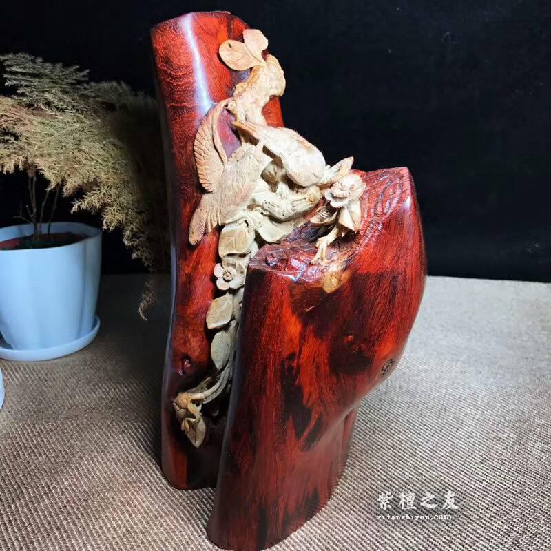 刚打磨成品,净重3.8斤小叶紫檀巧雕花鸟长14高28