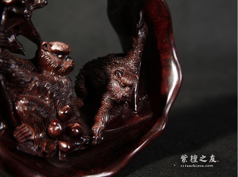印度小叶紫檀灵猴摘桃摆件,手工雕刻,高15CM重约535.1g,斑驳虎纹,值得拥有!价格:2999元!